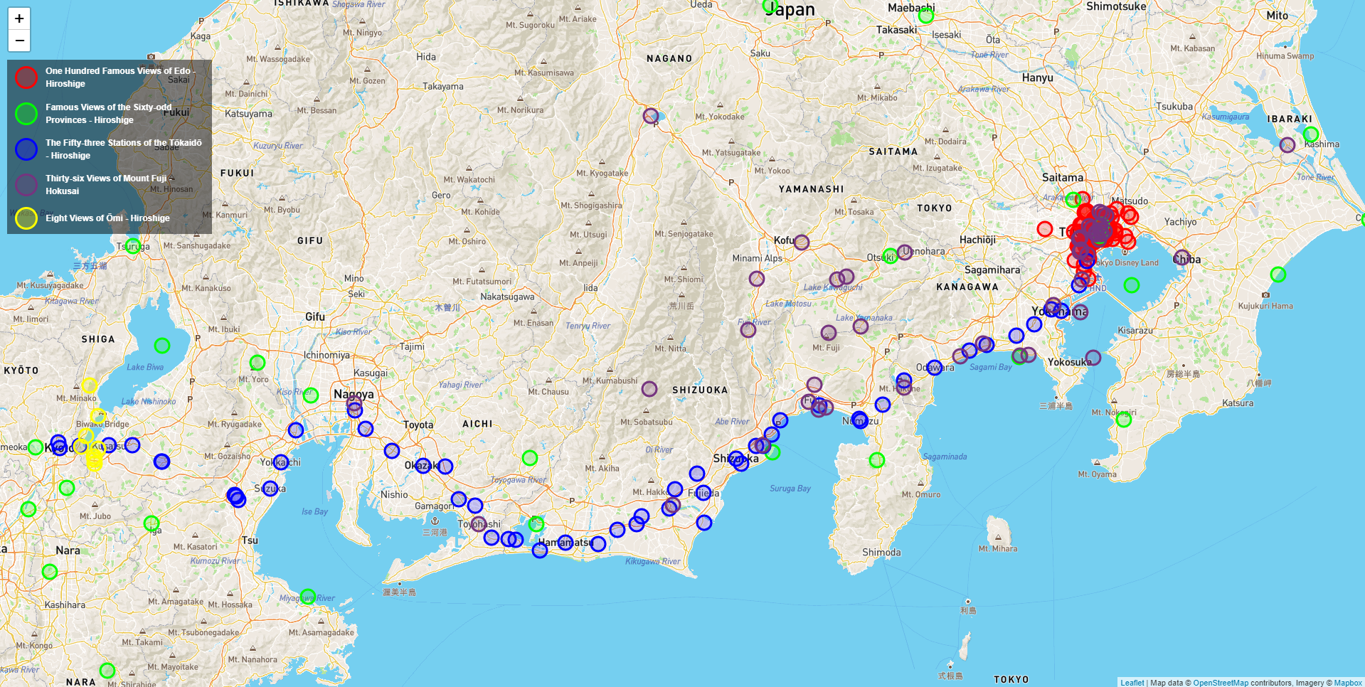 A few years ago I was in a C++ job, learning lots about the language and its surrounding technologies full time, and I found myself wanting to develop myself in other technologies in my spare time. At the same time I was also frustrated at the lack of visual maps of Japanese woodblock print locations plotted on a map plotted on maps that were available on the internet. This may sound peculiar, but these prints are often done in series focussed on either a specific location (Mt. Fuji or modern day Tokyo), or along a journey between cities.